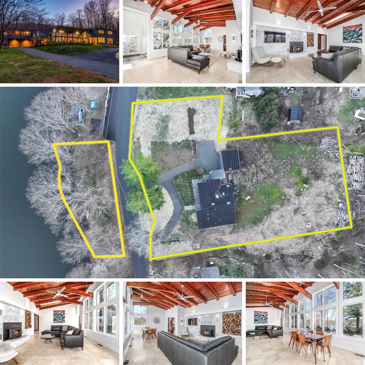 Set on 1.31 beautifully landscaped acres across from Lake Mamanasco, this architecturally striking 4-bedroom, 3-bath mid-century modern home offers unobstructed, year-round water views and a distinctive facade designed to capture natural light. A dramatic two-story foyer with slate flooring opens to sun-filled living spaces with soaring ceilings, exposed beams, and walls of glass. The open-concept great room with wood-burning stove flows into a stunning dining area. The updated eat-in kitchen features custom cabinetry. A stylish glass barn door leads to a hall with custom millwork, built-ins, exposed brick accent wall, updated half bath, and new laundry area. The primary suite offers walk in closets, vaulted ceilings, plus a separate sitting area ideal for office or nursery. Primary bathroom fully renovated with high-end fixtures (Frank Webb), rain shower, double sinks, anti-fog mirrors, bidet, and barn door entry. Two additional bedrooms, including one with a loft, offer flexibility, while a den/TV room provides additional living space. Updates include renovated baths, fresh paint, and new flooring. Enjoy a stone patio and serene setting. Two-car garage with unfinished space above offers expansion potential. New roof 2020. Includes 2 parcels: 1.31-acre homesite plus .20-acre waterfront lot. OPTIONAL membership to Mamanasco Beach Club.